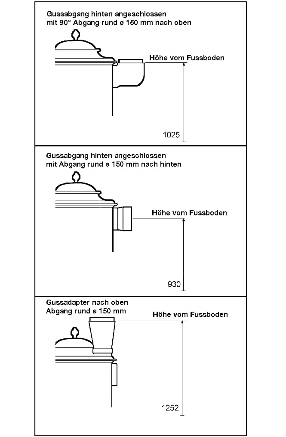Standard Rauchrohrabgang hinten gerade raus. Es gibt optional auch die Möglichkeit, nach hinten und 90° nach oben oder mit einem Adapter (von oval auf rund) nur nach oben anzuschliessen. Siehe Skizzen unter Fotos.