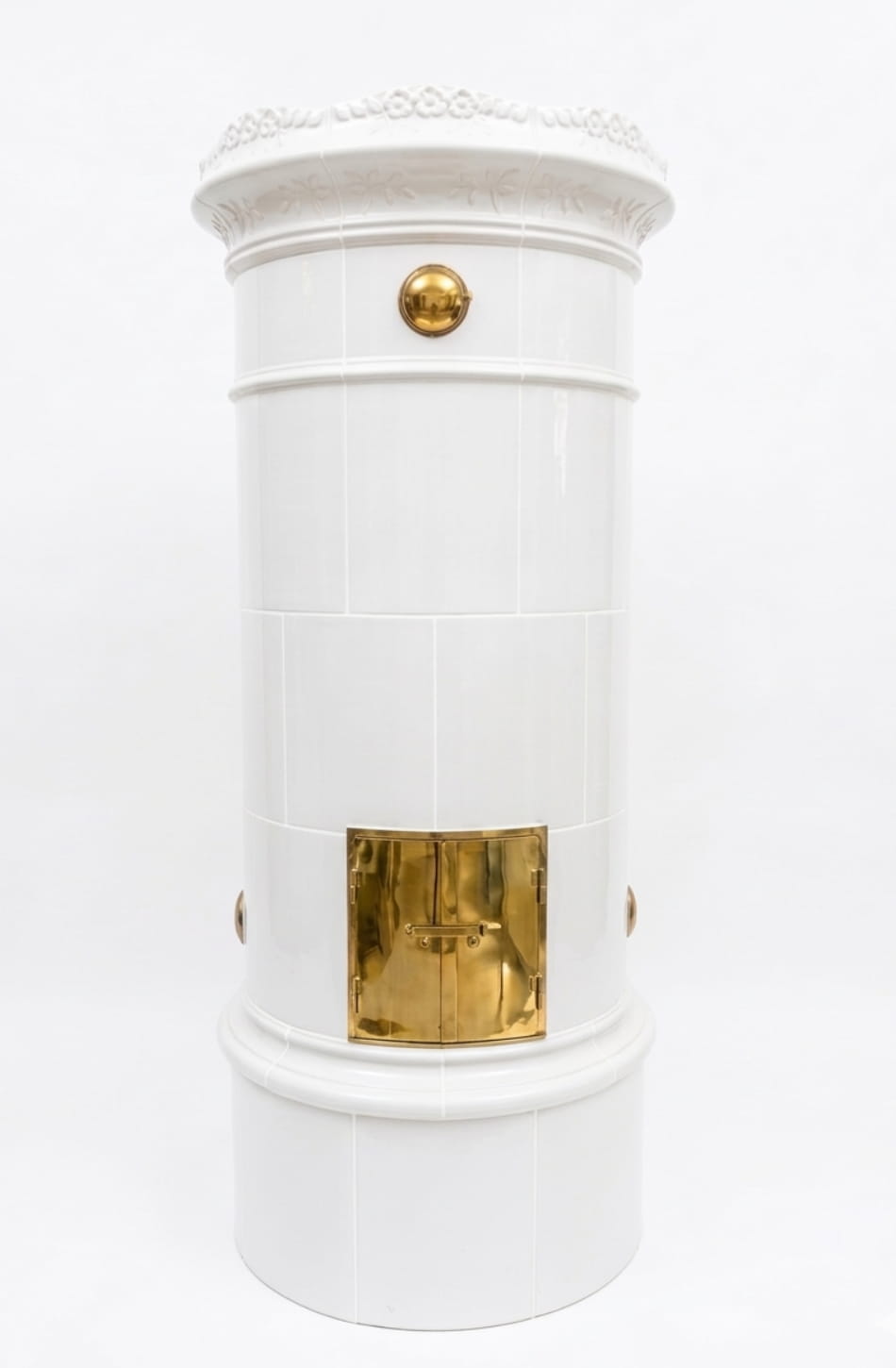 Neu hergestellter vollrunder Kachelofen, der aus einem Original aus unserem Bestand hervorgegangen ist.