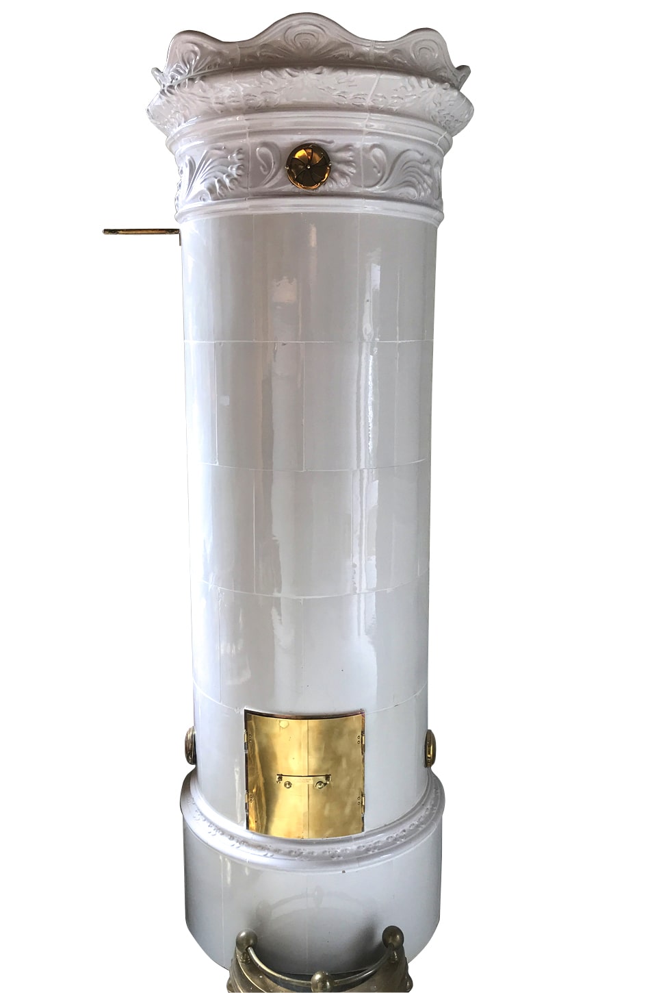 Antiker Kachelofen aus Südschweden der Stadt Karlskrona mit Jugendstilkrone. Baujahr ca. 1900. Höhe 2,35 m. Guter Zustand mit originalen Messingtüren. Kachelgenwand für den Aufbau in einer Raumecke.