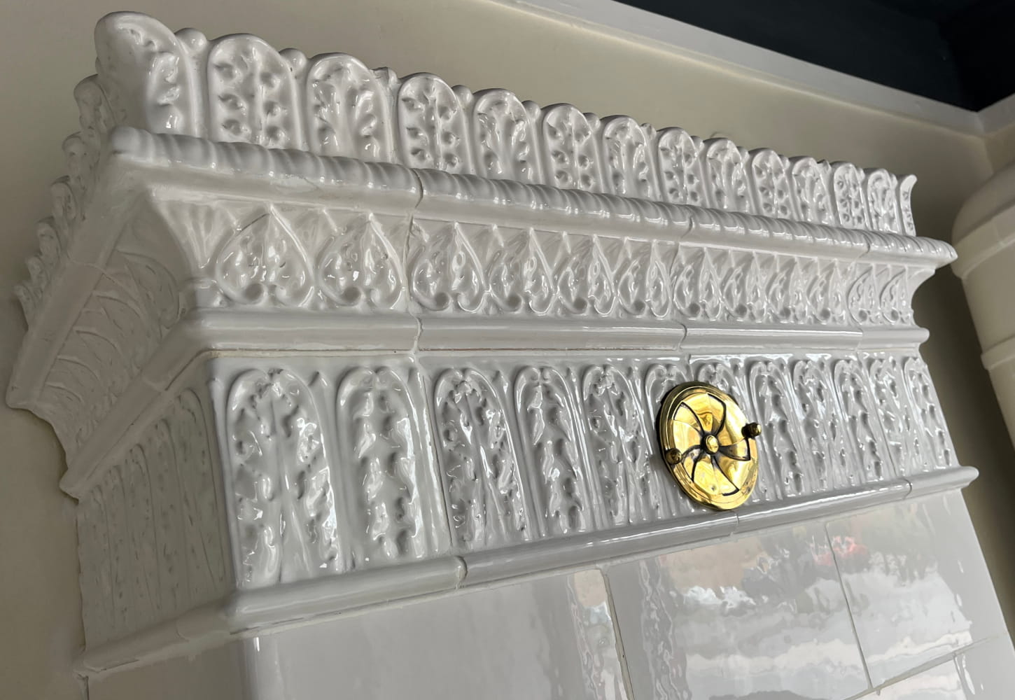 Schwedischer Kachelofen mit elektrischer Beheizung. Dieses Angebot ist ein kompletter Ofen INKLUSIVE Aufbau bei Ihnen im Wohnzimmer. Eine Std. Heizzeit reicht aus, stundenlange Speicherwärme zu geniessen. Hinter der Messingtür ist ein Schalter angeordnet und im Inneren des Ofens befinden sich zwei Heizplatten mit je 500 Watt Leistung, welche vom Spezialhersteller Loysch aus Östereich seit Jahrzehnten genau für diesen Zweck produziert werden. Jugendtil antike Kachelware weiss in kompakten Abmessungen, ideal für kleinere Räume. Für den Aufbau an einer geraden Wand oder in einer Raumecke geeignet. Höhe ca. 2,20 m. Metallteile (Putzkappen) und Ziertüren in Messing.