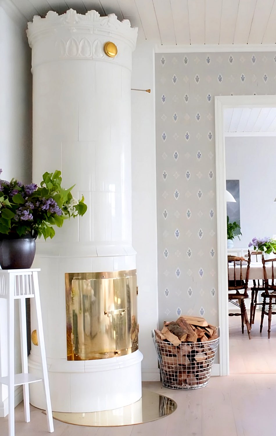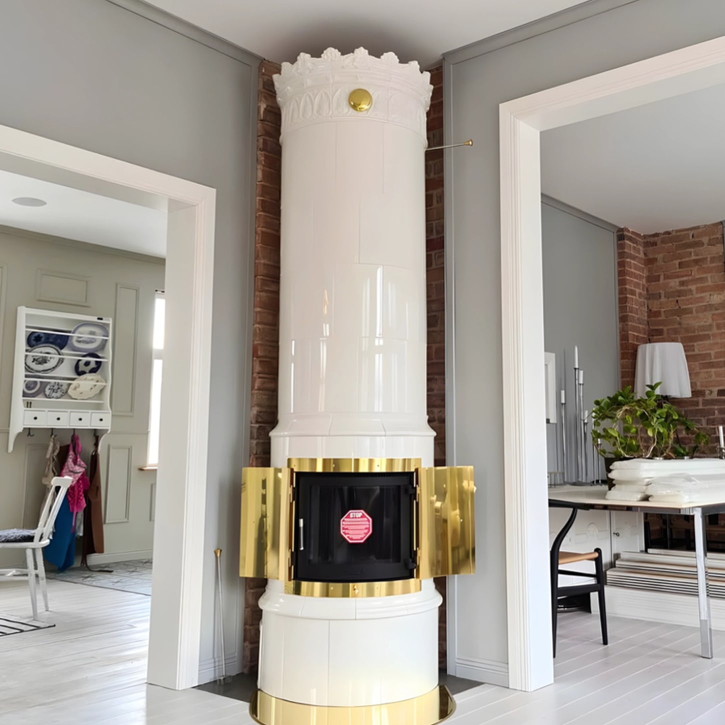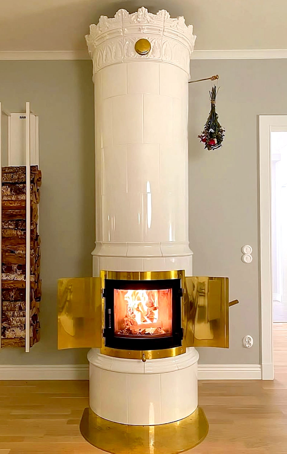 Karl-Johan, schwedischer Speicherkachelofen rund, weiss glänzend von Gabriel Keramik AB. Ein Gabriel Speicherkachelofen bringt richtig Speichermasse mit. Bis zu 1300 kg Olivinstein aus Norwegen, einem hoch wärmespeichernden Material, sorgen für sehr gute Wirkungsgrade. Hohe Effizienz, niedriger Holzverbrauch und lange Wärme kennzeichnen den schwedischen Kachelofen. So heizt man damals wie heute umweltfreundlich mit CO2 neutraler Holzfeuerung und sehr guten Abgaswerten.