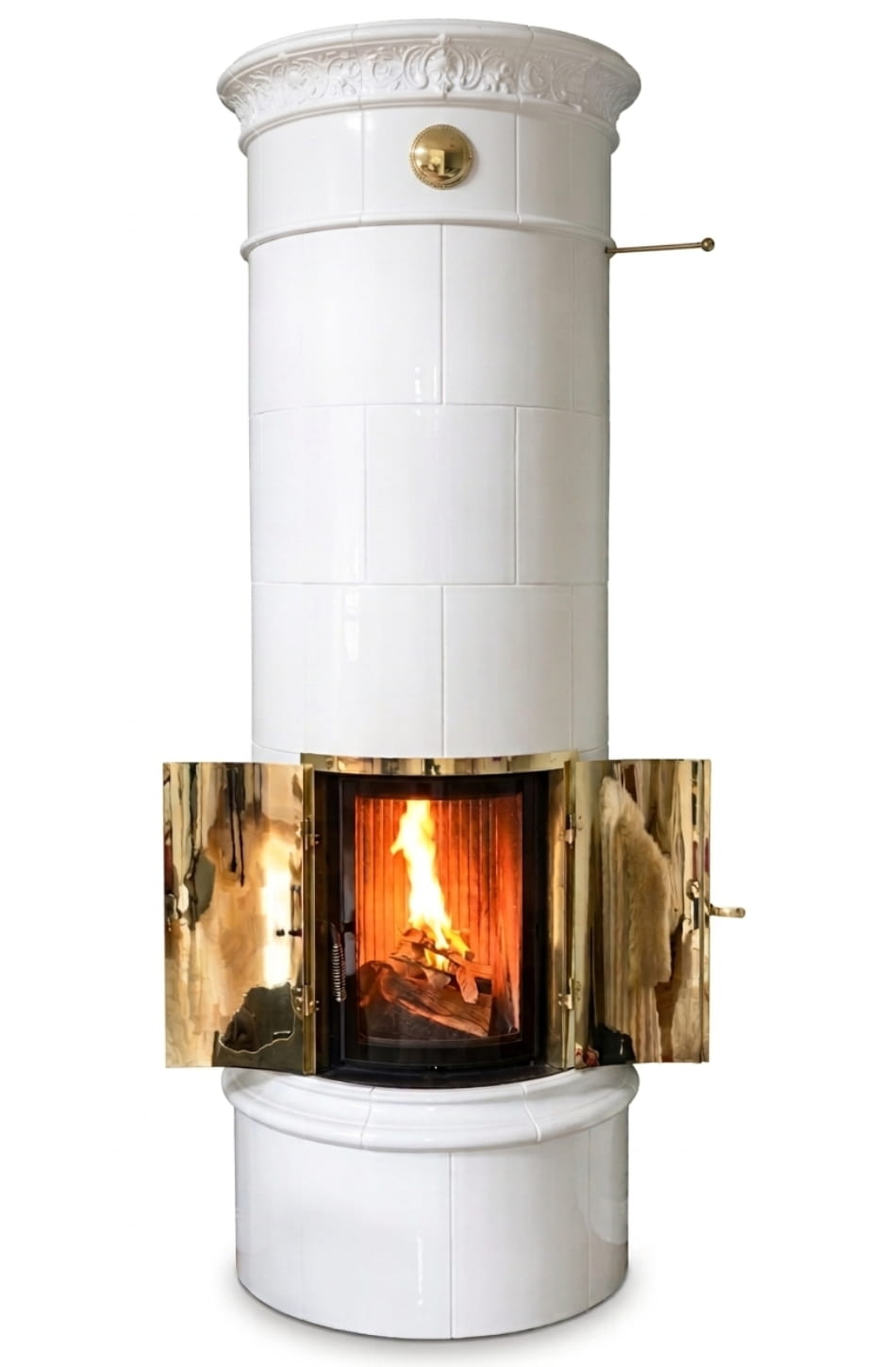 Ljungby Zylinderkachelofen mit einer feiner Verzierung und zugleich schlichter Krone. Ljungby ist eine Kronenform unserer neu hergestellten SchwedishClassics Collection. Im inneren werden die Kacheln traditionell mit richtigem Schamottestein ausgemauert. In der hier gezeigten Ausführung ist der Ofen mit einem Gusseisenheizeinsatz der bayerischen Firma Brunner komplettiert, um mehr Leistung zu bekommen und nicht zuletzt die große Scheibe mit der perfekten Feursicht zu genießen.