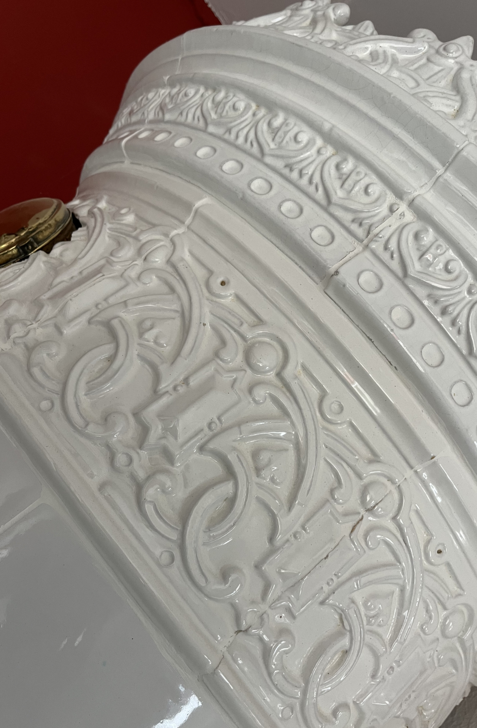 Originale Messingtüren. Eine Glastür hinter den Messingtüren kann selbstverständlich eingebaut werden. 5/8 Kachelrundung für die Raumecke Hersteller: Karlskrona Kachelofen Manufaktur. Dieses Ofenangebot umfasst die Kacheln und die Metallteile, das sog. Ofengeschränk. (Der Aufbau und dafür nötiges Schamottematerial ist im Ofenpreis nicht enthalten. Zusätzlich benötigen Sie einen typgeprüften Brennraum. z.B. Swedishclssics ECO. Die Kachelware ist Differenzbesteuert gem. §25a Umsatzsteuergesetz, Besteuerung von Gebrauchtwaren, d.h. die Mehrwertsteuer wird nicht gesondert ausgewiesen.) Gerne bieten wir Ihnen den Aufbau ebenfalls an. Unsere Brennräume sind in Deutschland typgeprüft, erfüllen die BImSchV. Stufe 2. Wir garantieren die Abnahme durch Ihren Schornsteinfegermeister.