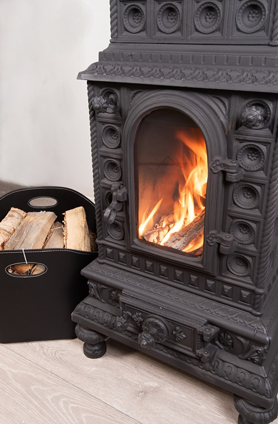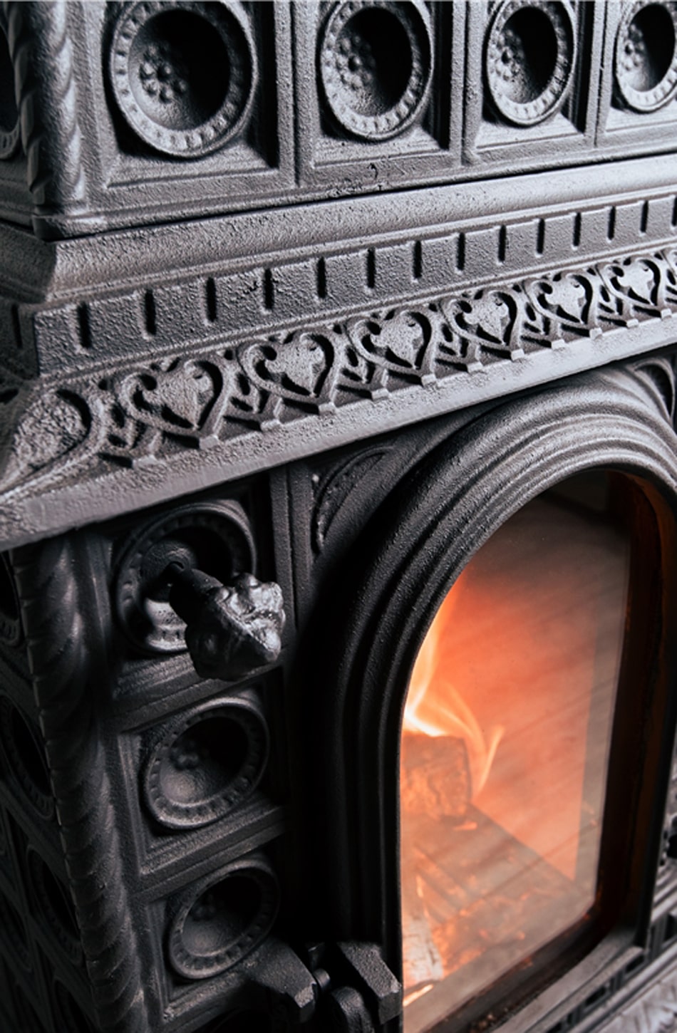 Die Tür ist im Standard mit klarer Scheibe ausgestattet, kann aber wahlweise preisgleich auch mit Gusseisenverzierungen vor der Scheibe geliefert werden. Bitte bei der Bestellung angeben.