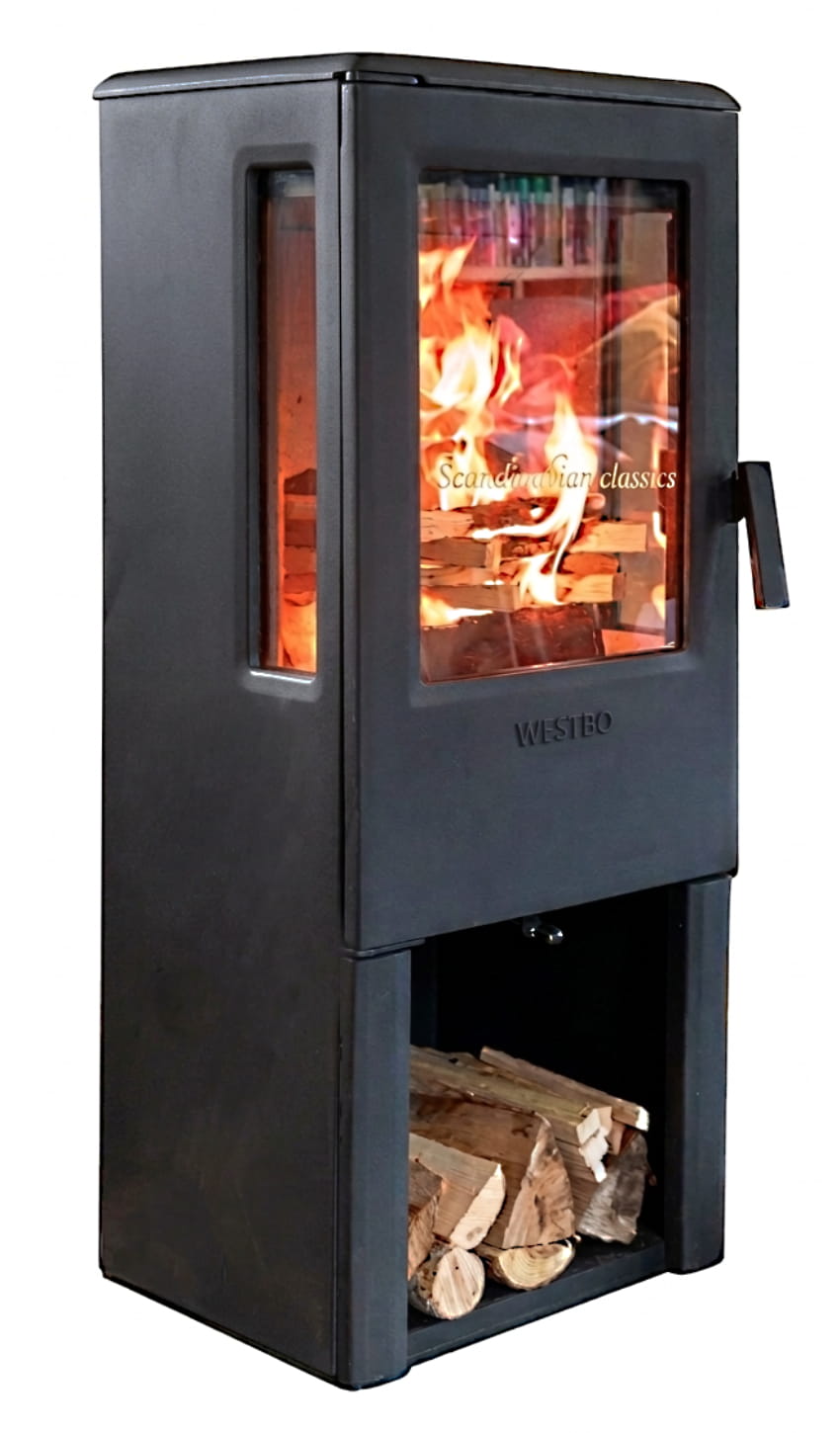 Der kompakte Westbo Nobel Gusseisenofen überzeugt mit seinen klaren Linien im modernen skandinavischen Retrodesign. Schlanke Türprofile rahmen das Feuer ein, mit Seitenscheiben, so haben Sie aus allen Seiten eine sehr gute Sicht auf die Flammen.
